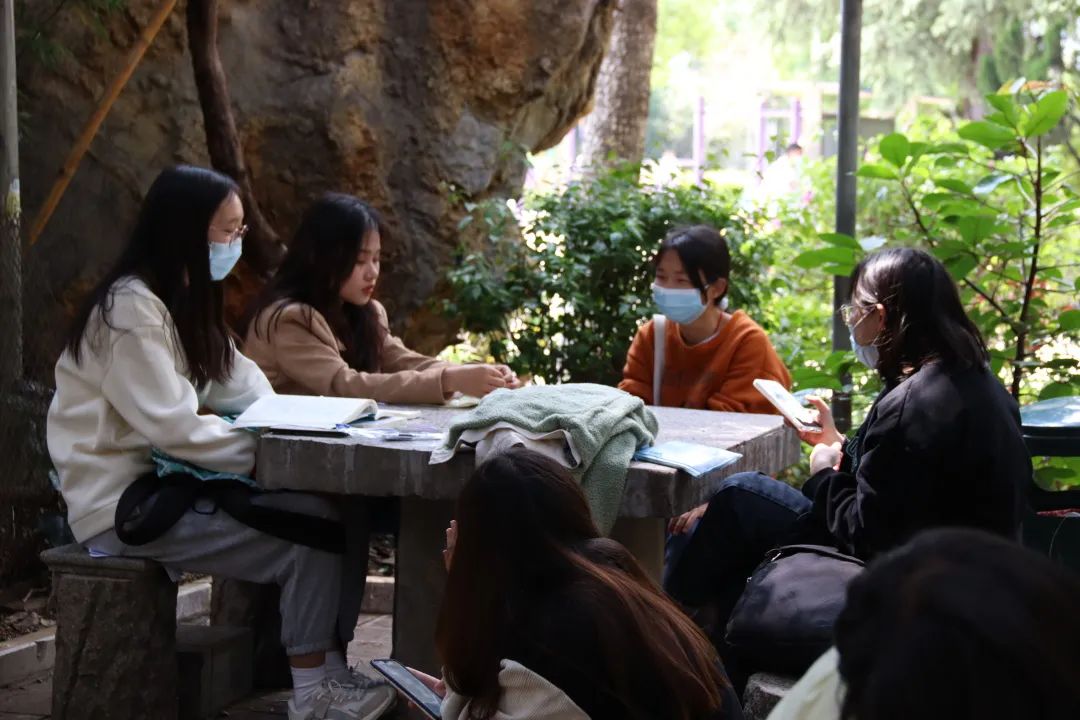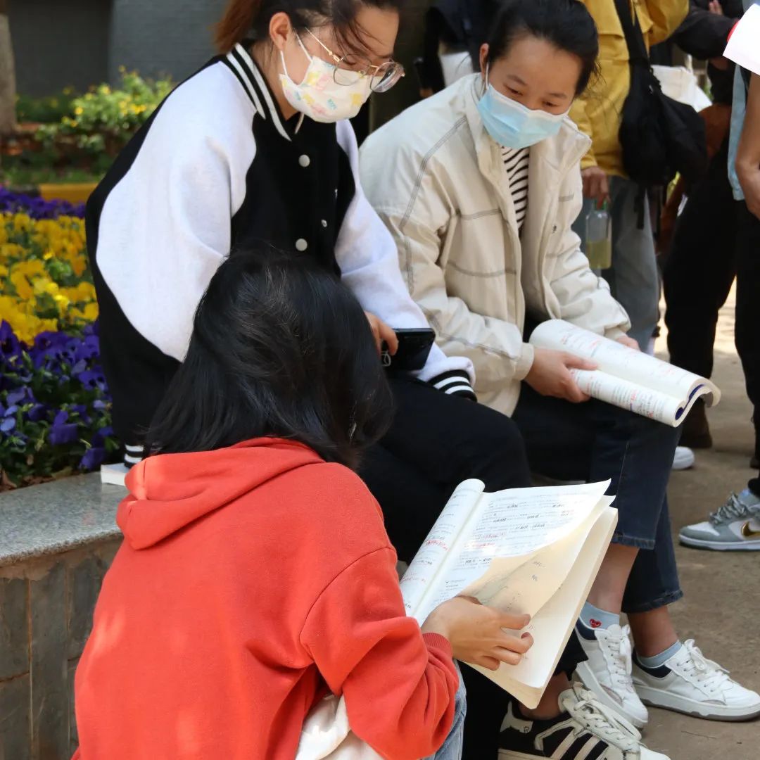 考场外,有的考生已经早早在等候,她们抓住点滴时间埋头复习,只为能成功上岸。