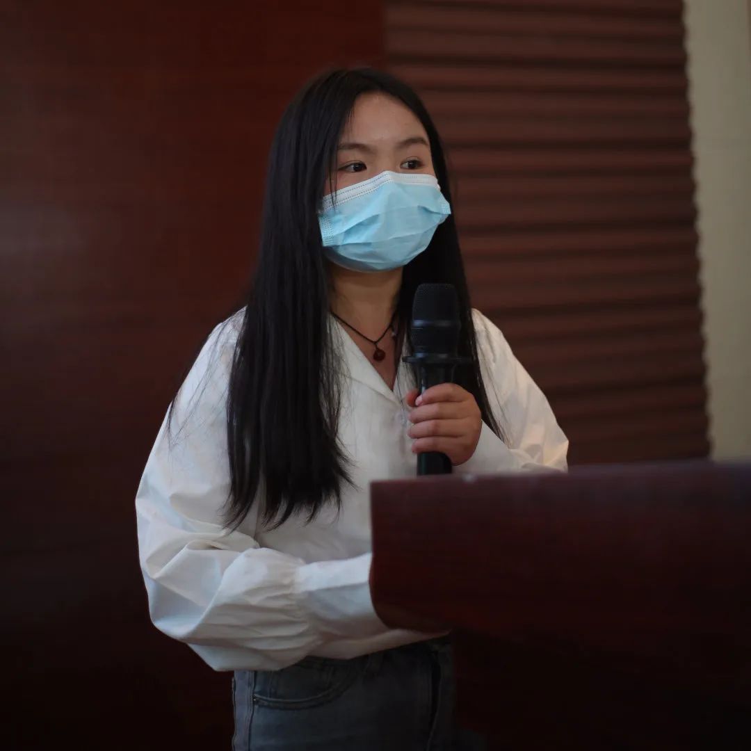 2021级新任社长马梦华上台发言:“感谢老师和同学对我工作能力的认可,同时我会不断努力提高自己的能力,带领大家把自媒体社发展的更好。”