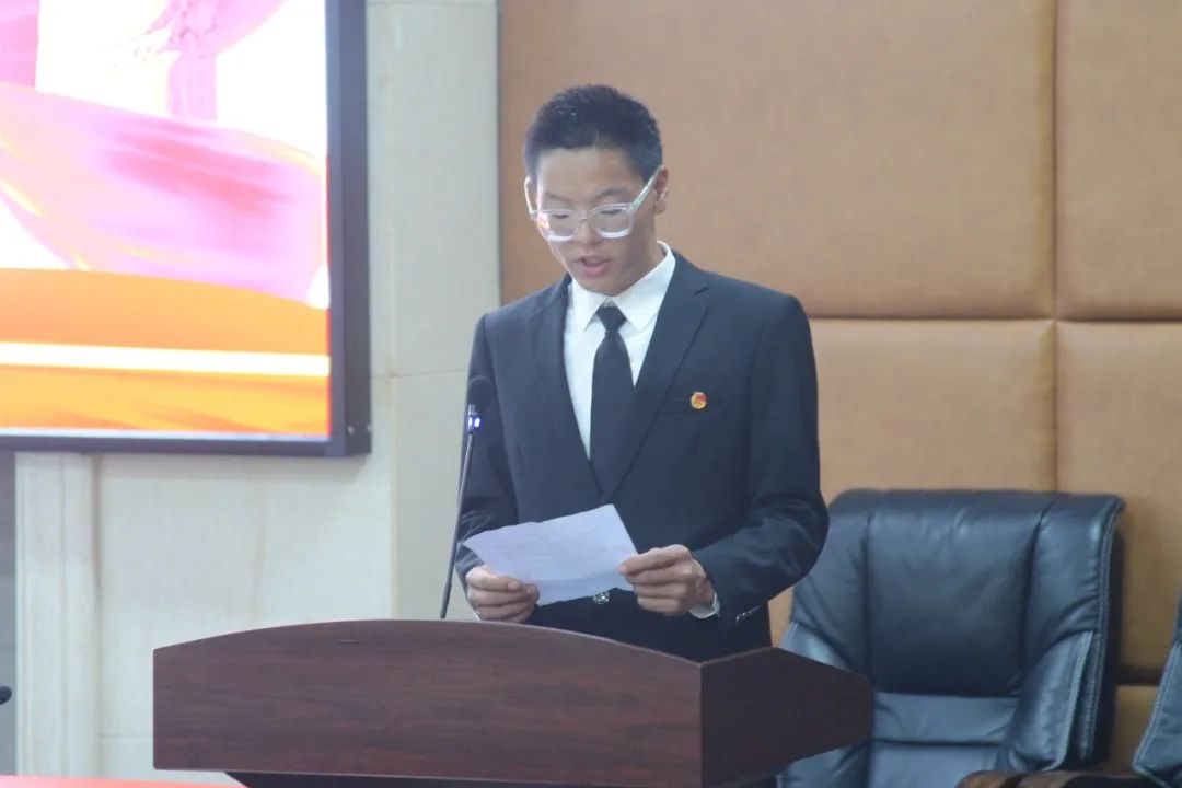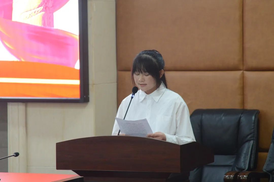 优秀共青团干部代表、新老团员代表分别上台发言。他们表示,身为共青团员,要积极展现青年强国有我的担当,用智慧和汗水奏响青春乐章,团结同学,传承并发扬“五四精神”,不断加强政治理论武装、学好科学文化知识,用实际行动实现入团誓言,用青春擦亮梦想的底色。