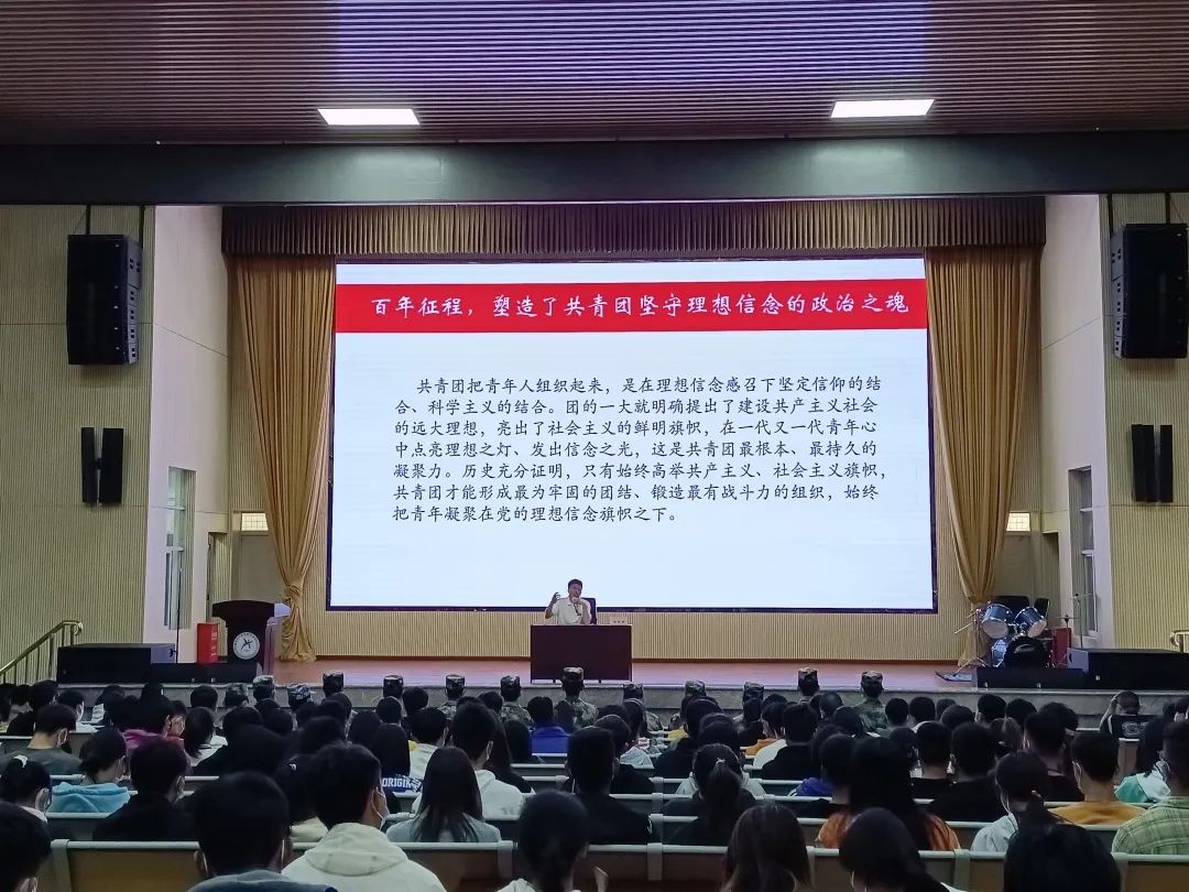 校团委副书记陈明照老师以重温入团誓词开头,从回望百年征程光荣激昂、深入领会习近平总书记重要讲话的重大意义和深刻内涵以及切实把习近平总书记重要讲话精神贯彻到共青团和青少年工作全过程各领域三个方面带我们走进今天的学习习近平总书记在庆祝中国共产主义青年团成立100周年大会上的重要讲话精神主题团课。