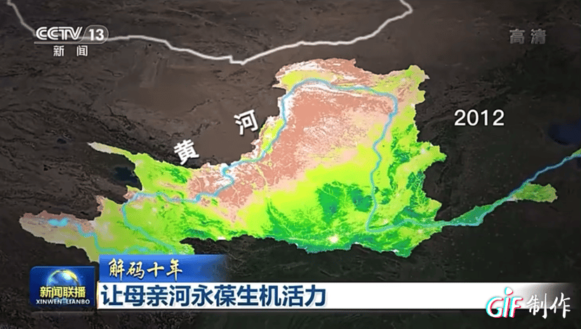 这是卫星视角拍摄到的黄河,研究人员连续数年监测,结合大数据还原了黄河沿岸的生态状况变化。可以清晰地看到,十年间绿进沙退,这条黄河生态绿线,最宽处向前推进了约150公里。