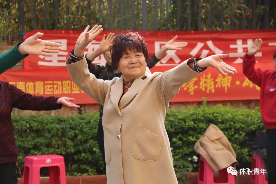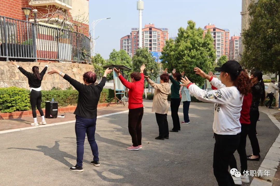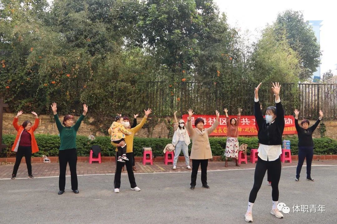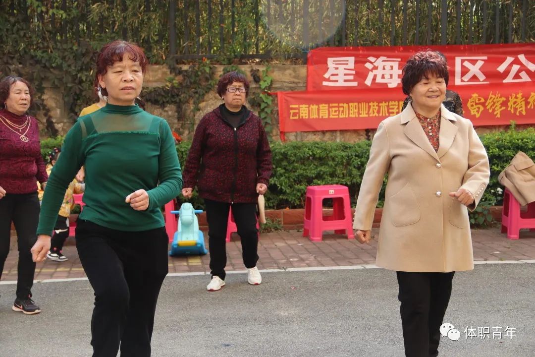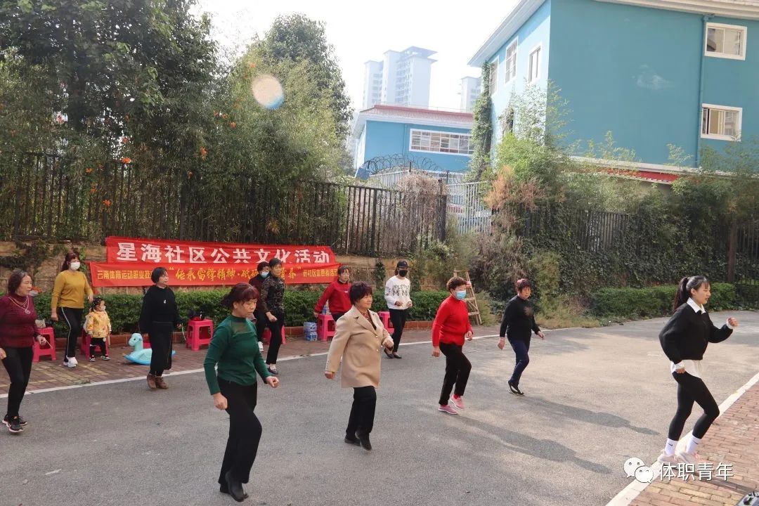 2023年3月15日,体职院团委组织啦啦操校队的同学来到昆明市西山区星海社区,为社区的中老年人带来了一场健身操公益课。