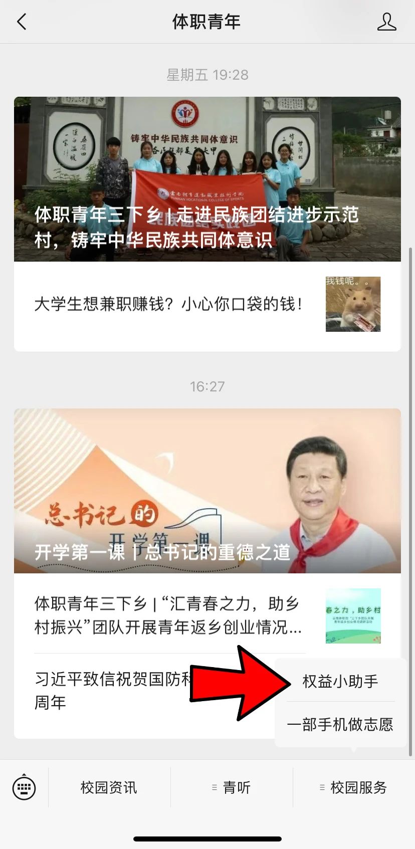 第二步:第二步:进入公众号后,打开右下角菜单,点击“校园服务”后点击“权益助手”