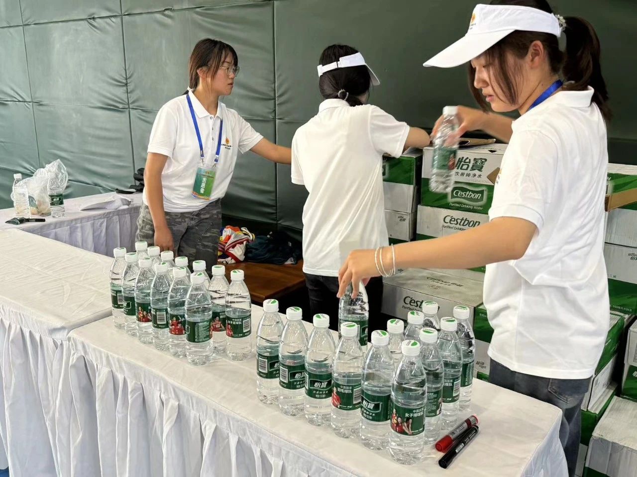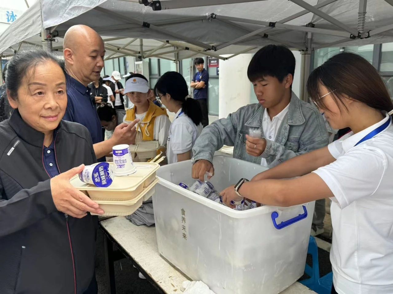 饮水区的志愿者,积极联系后勤,确保饮用水的正常供应,为运动员们注入“活力”。餐食区的志愿者,负责协助后勤为裁判员、工作人员等发放餐券、餐食。