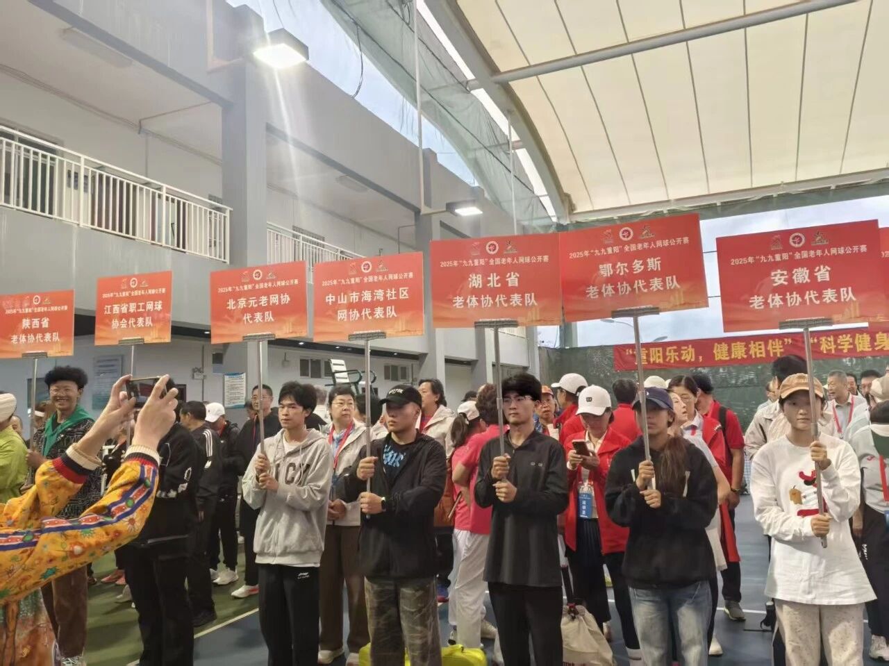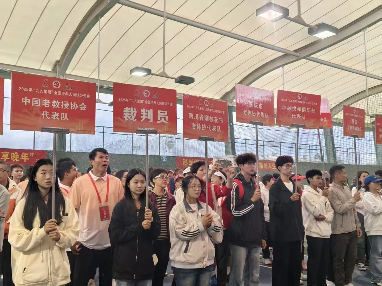 10月10日上午,2025年“九九重阳”全国老年人网球公开赛开幕式上,志愿者们纷纷举起各个代表队的牌子,更好地让各个省份的代表队人员找到属于自己队伍的站位。