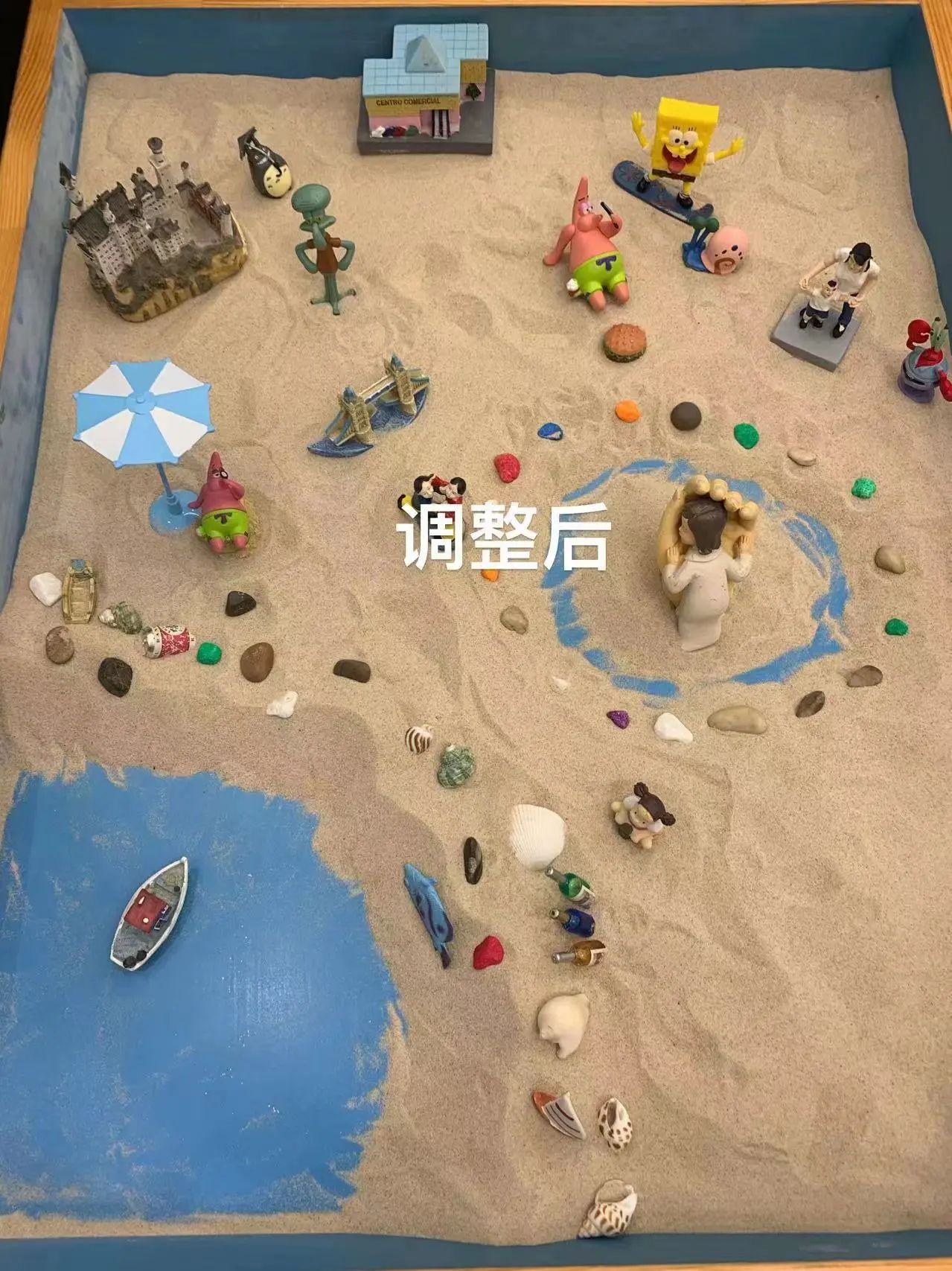 在沙盘游戏当中,随自己的心意去摆弄物件,创造出自己心灵的想法,摆出自己理想的环境,心灵得到了一定的放松,内心倍感舒适,压力也减小了很多,使我对往后的生活充满无限的遐想,对未来的一切都充满了期待,也让我有勇气面对未来的一切挫折与困难。
