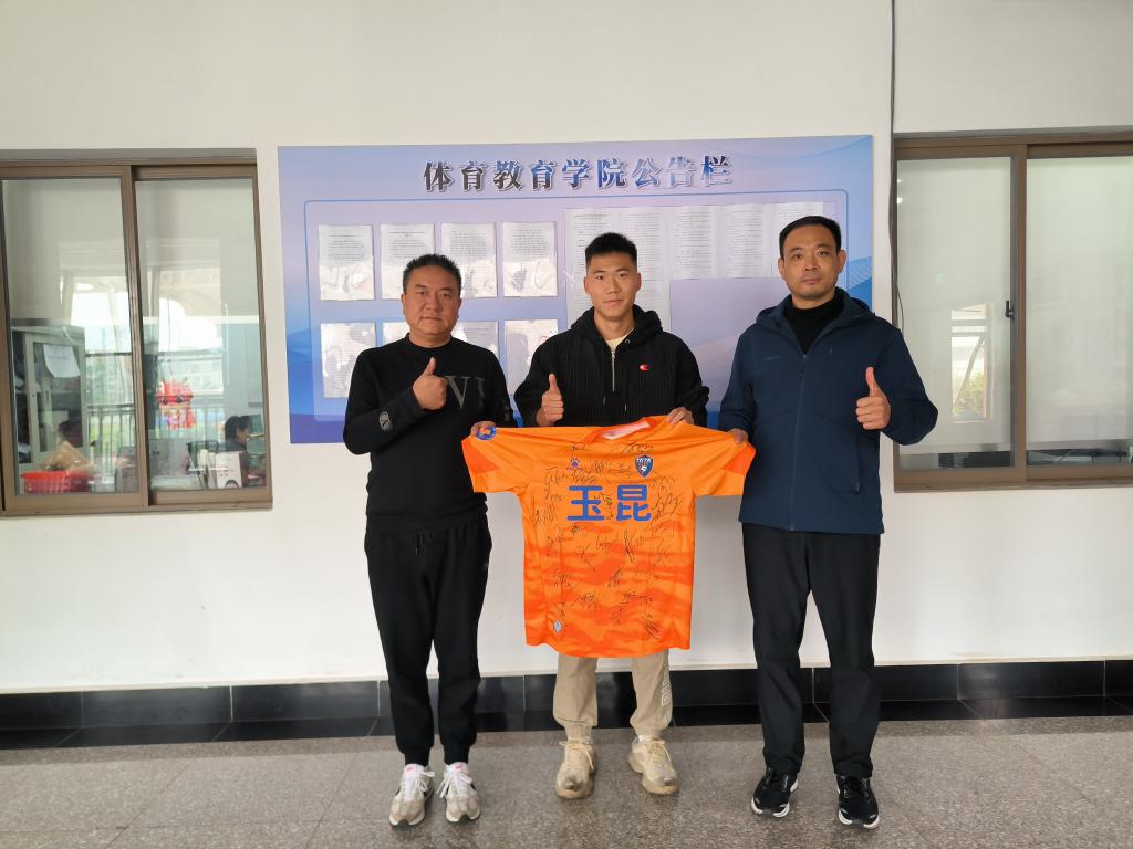 2024年10月10日,秋意渐浓,我院体育教育专业22级学生邱圣钧荣誉归来为学校建校六十周年高质量发展论坛献礼。作为玉昆足球队的关键成员,他在绿茵场上的卓越表现助力球队在中甲联赛第26轮中以2-0战胜上海嘉定汇龙,成功晋级中超联赛。在云南足球21年的等待后,这一胜利尤为珍贵。邱圣钧此次回访,向学院赠送了一件签名球衣,以此表达对母校的感激之情,同时也展现了他在体育道路上的坚持与奋斗。