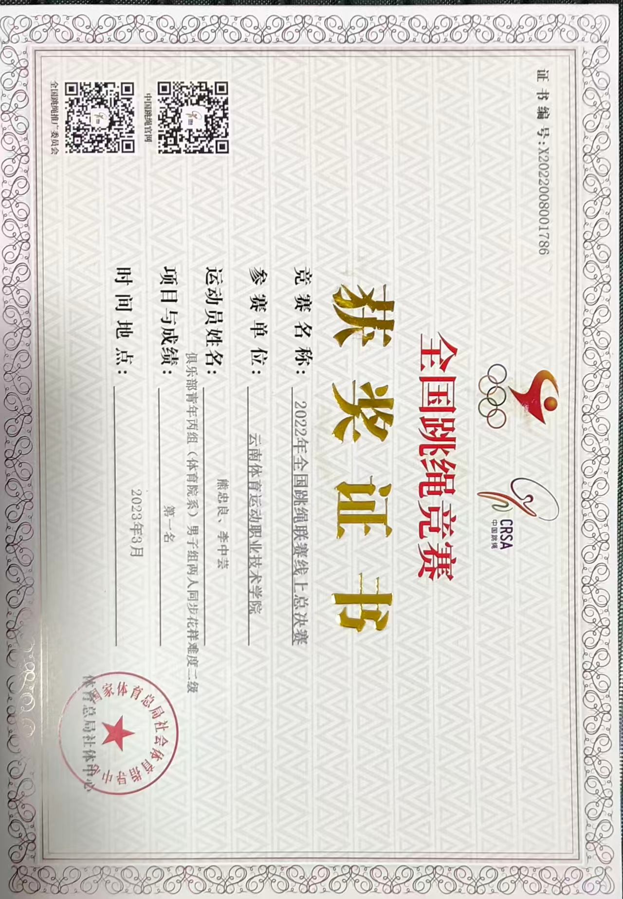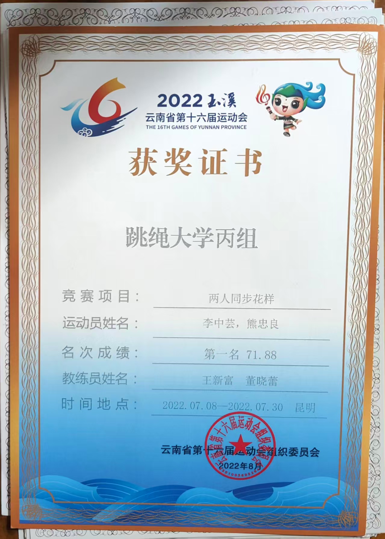 熊忠良与李中芸自2022年起在跳绳赛场上屡创佳绩。两人在云南省第十六届运动会丙组两人同步花样比赛中夺得第一名,同年又在2022年全国跳绳联赛(线上)总决赛中斩获两人同步花样冠军。2023年,他们凭借出色表现入选跳绳国家队,两人还在中国国际公开赛等多项赛事中取得优异成绩。