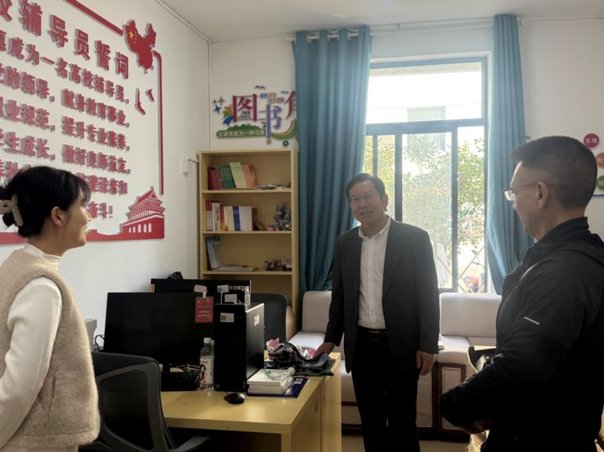 在辅导员办公室、党团活动室、心理辅导站、共享休闲空间等功能场所,校领导一行实地察看空间利用效率、硬件设施配置及日常管理模式,与入驻辅导员深入交流,详细了解思政教育开展、学业帮扶推进、学生权益保障等工作的落实情况,对各功能区“一站式”集成服务的创新实践给予肯定。