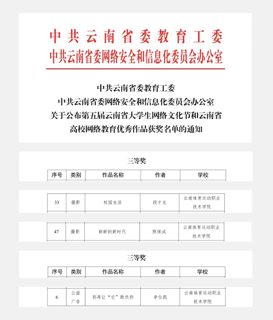 根据《中共云南省委教育工委中共云南省委网络安全和信息化委员会办公室关于开展第五届云南省大学生网络文化节和高校网络教育优秀作品推选展示活动的通知》精神,经学校推荐、专家评选、公示等环节,共评选出“大学生网络文化节”微视频等9类优秀作品共523件;“高校网络教育优秀作品推选展示活动”4类优秀作品124件。其中best365共有3个作品获奖,2019级体教1班段才龙的作品《校园生活》,2019级体教7班陈保成的作品《崭新的新时代》荣获摄影类三等奖,2019级新闻班李仕凯的作品《别再让“它”欺负你》荣获公益广告类三等奖。希望获奖同学珍惜荣誉,戒骄戒躁,再创佳绩。