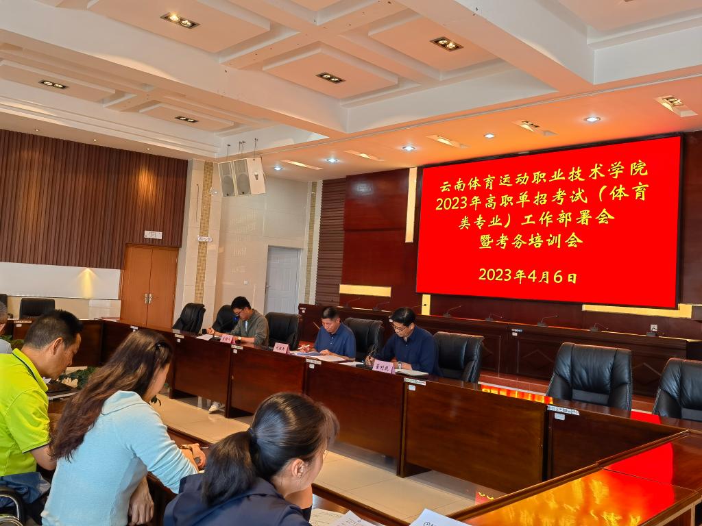 招考试(体育类专业)工作部署会暨考务培训会,党委副书记、院长代红兵,副院长董利民出席会议,南琼考试系统主要负责人,各部处室、二级学院、中高后勤以及考务人员参加会议。会议由招生就业处负责人主持。 会议指出,此次高职单招考试(体育类专业)根据《云南省2023年高职院校单独考试招生办法》通知要求,按照《best365中国官方网站2023年高职单招体育类专业测试实施细则》具体实施,测试采用“分组检录、分时段进行....