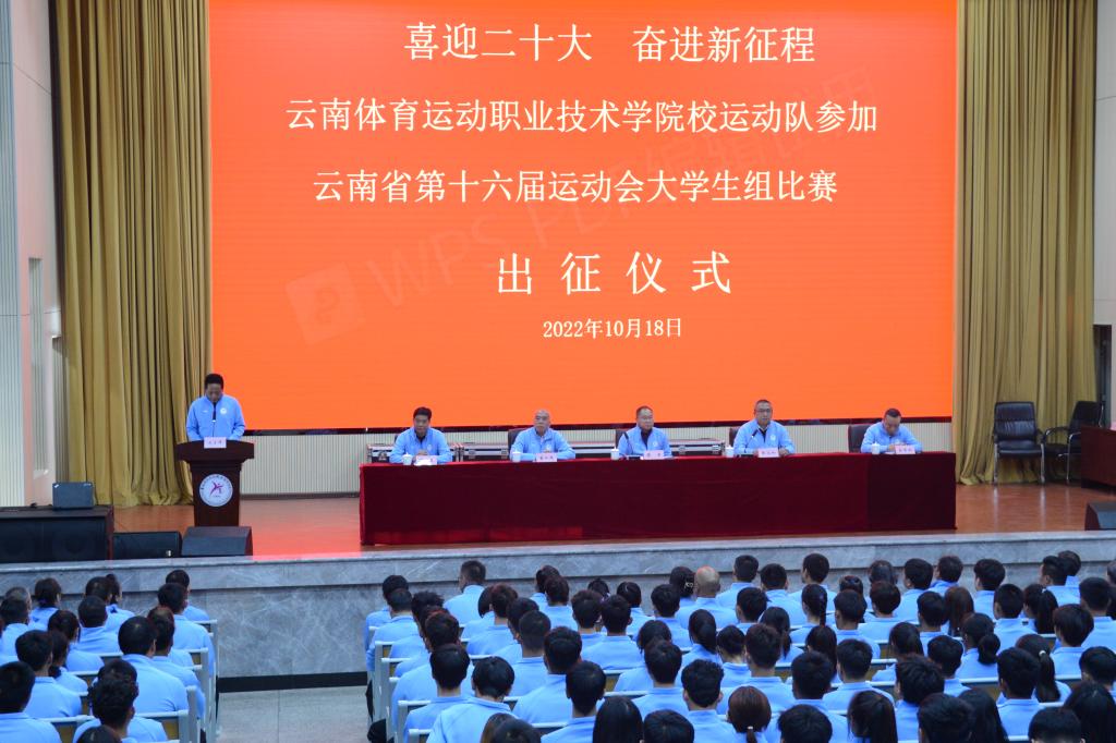 2022年10月18日下午,best365中国官方网站在学生礼堂举办云南省第十六届运动会大学组比赛学校代表团出征仪式。学校党委书记缪军,党委副书记张永和,副院长董从民,纪委书记金吉斌,副院长董利民出席此次出征仪式。校代表团各工作组成员,10支校代表队,各项目领队、教练员、运动员共计300余人参加了出征仪式,仪式由学校党委副书记张永和主持。出征仪式在庄严的国歌声中拉开序幕。竞技体育学院党总支书记李晋龙代表发言,...