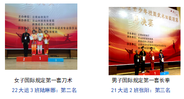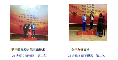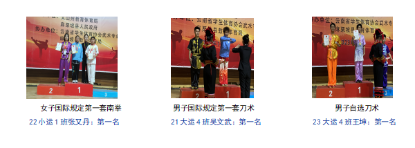 我院高丽琼和任典帅两名武术专任教师,选拔派出4男3女,共计7名同学,参加19个单项和1个集体项目的角逐。在比赛中,我院学生奋力拼搏、敢打敢拼,共斩获:金牌8枚,银牌4枚,铜牌1枚。获集体项目第一名,大学组团体总分第一名的可喜成绩。