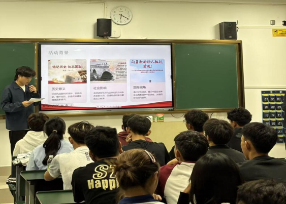 随后进行的“纪念中国人民抗日战争胜利80周年”主题团日活动,学院团总支围绕活动背景、抗战胜利的历史意义与世界反法西斯战争回顾等内容,结合阅兵仪式盛况与习近平总书记讲话精神,生动展现了中华民族在抗战中凝聚的伟大精神与中国在世界反法西斯战争中的重要贡献。活动通过影像资料、团歌学习、誓词重温等环节,营造了庄严而富有教育意义的氛围,增强了团员的历史认同感与组织归属感。