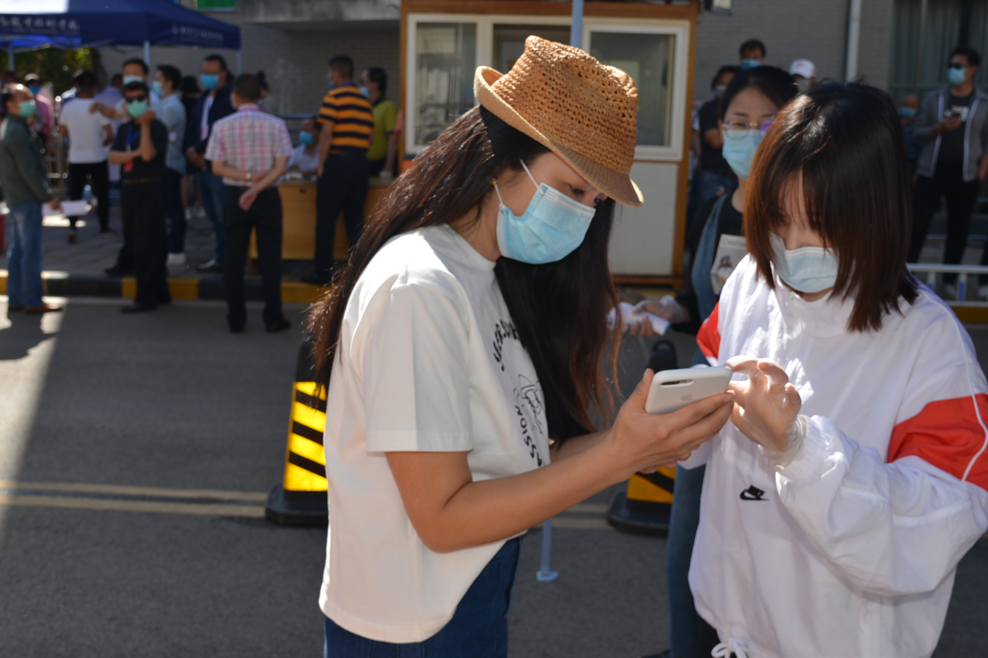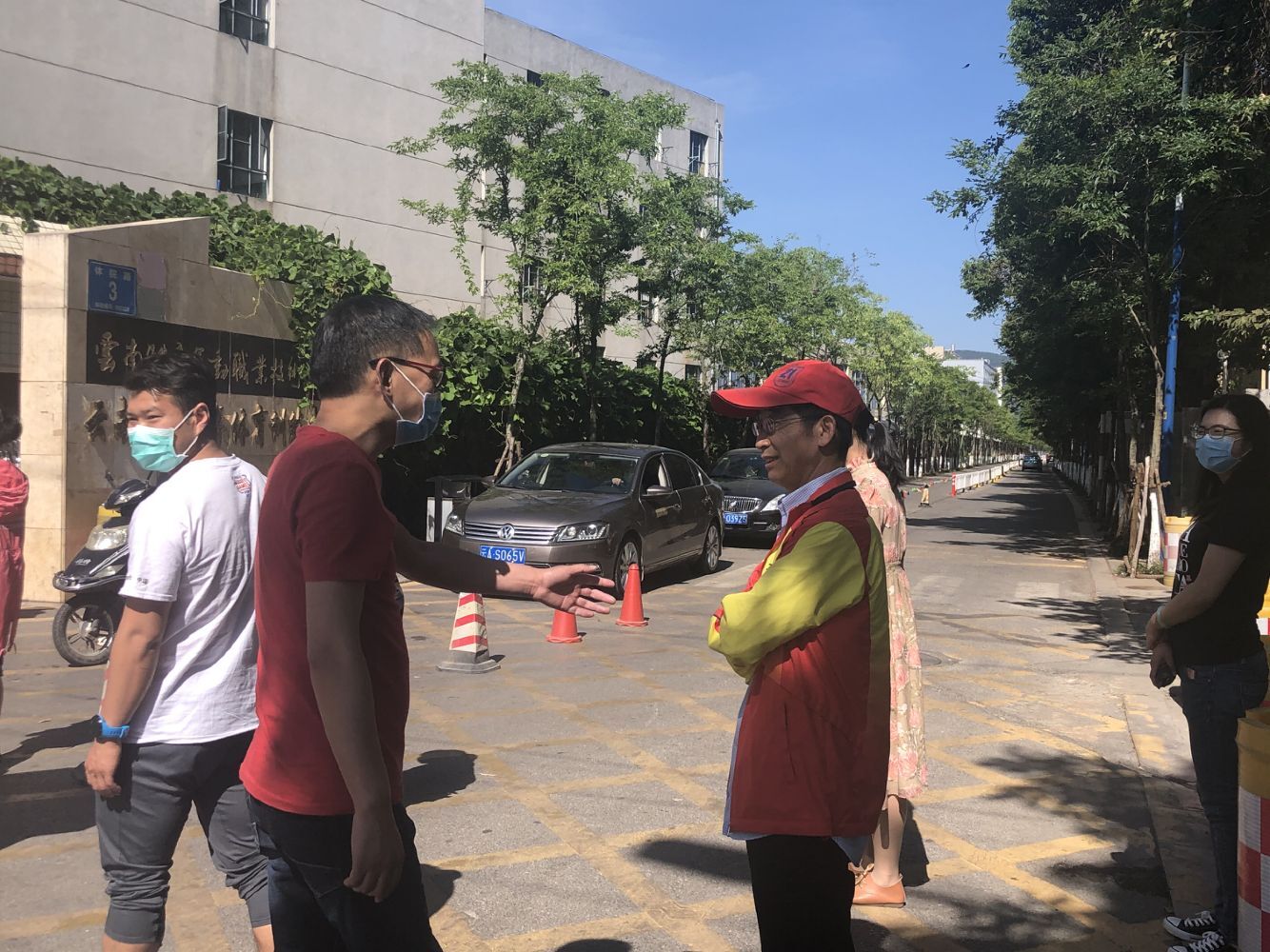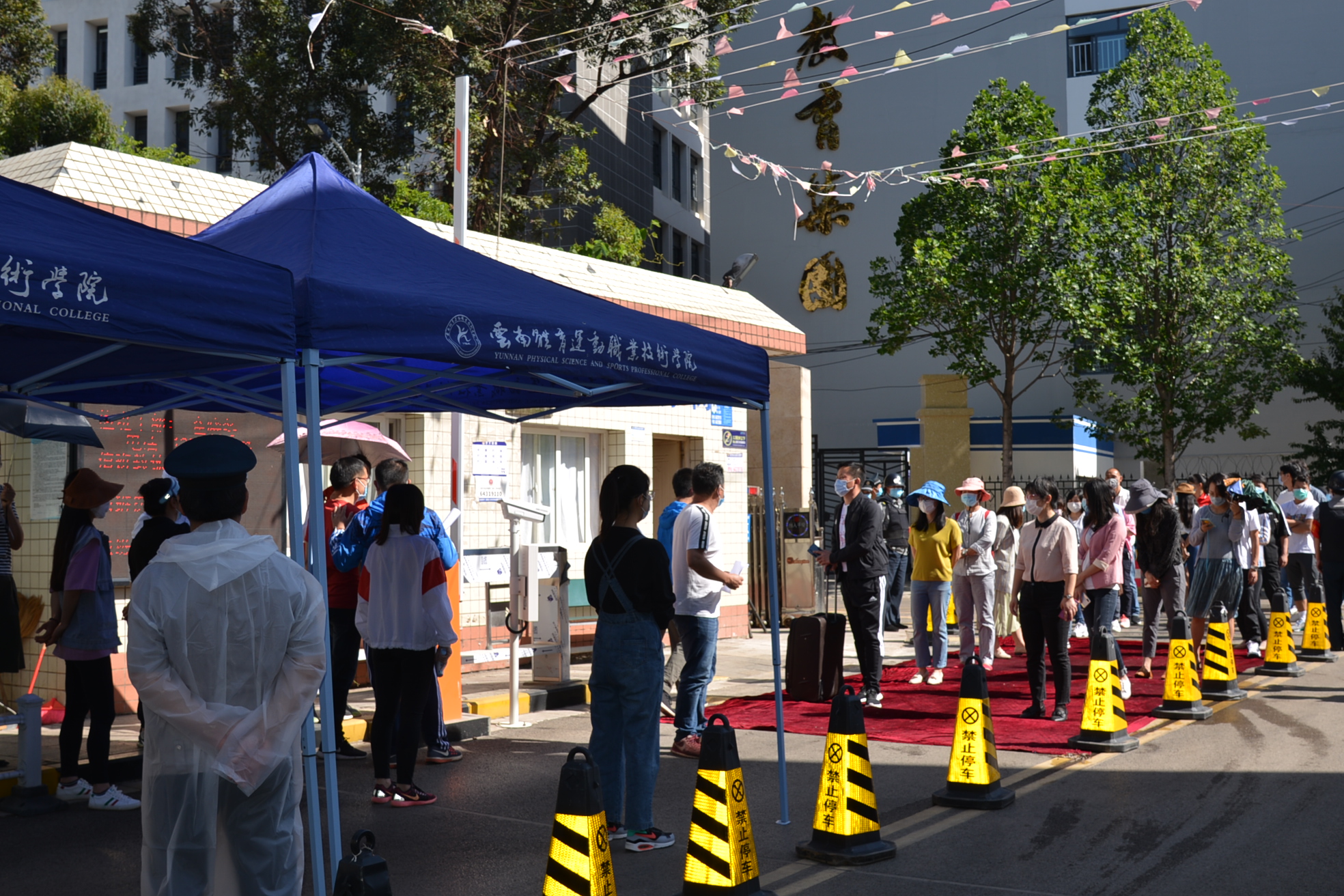 学生在志愿者引导下依次排队入校