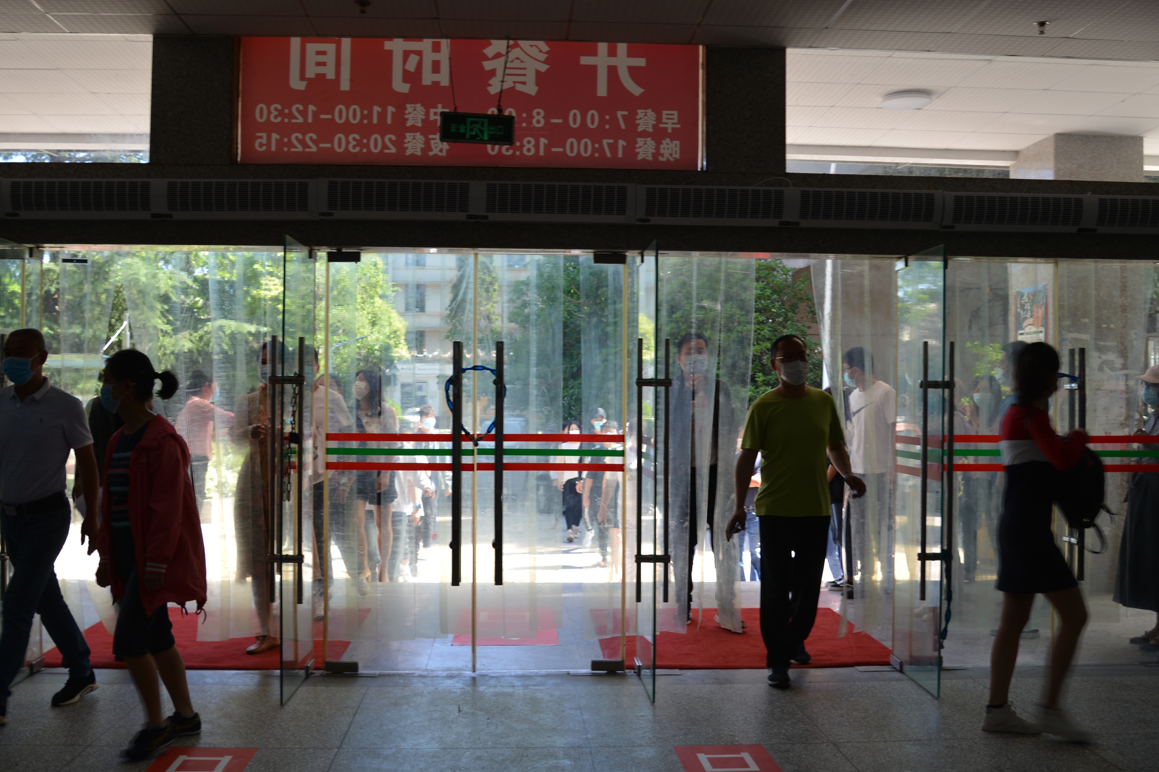学生在入口处排队等候,在引导员的引导下有序进入食堂