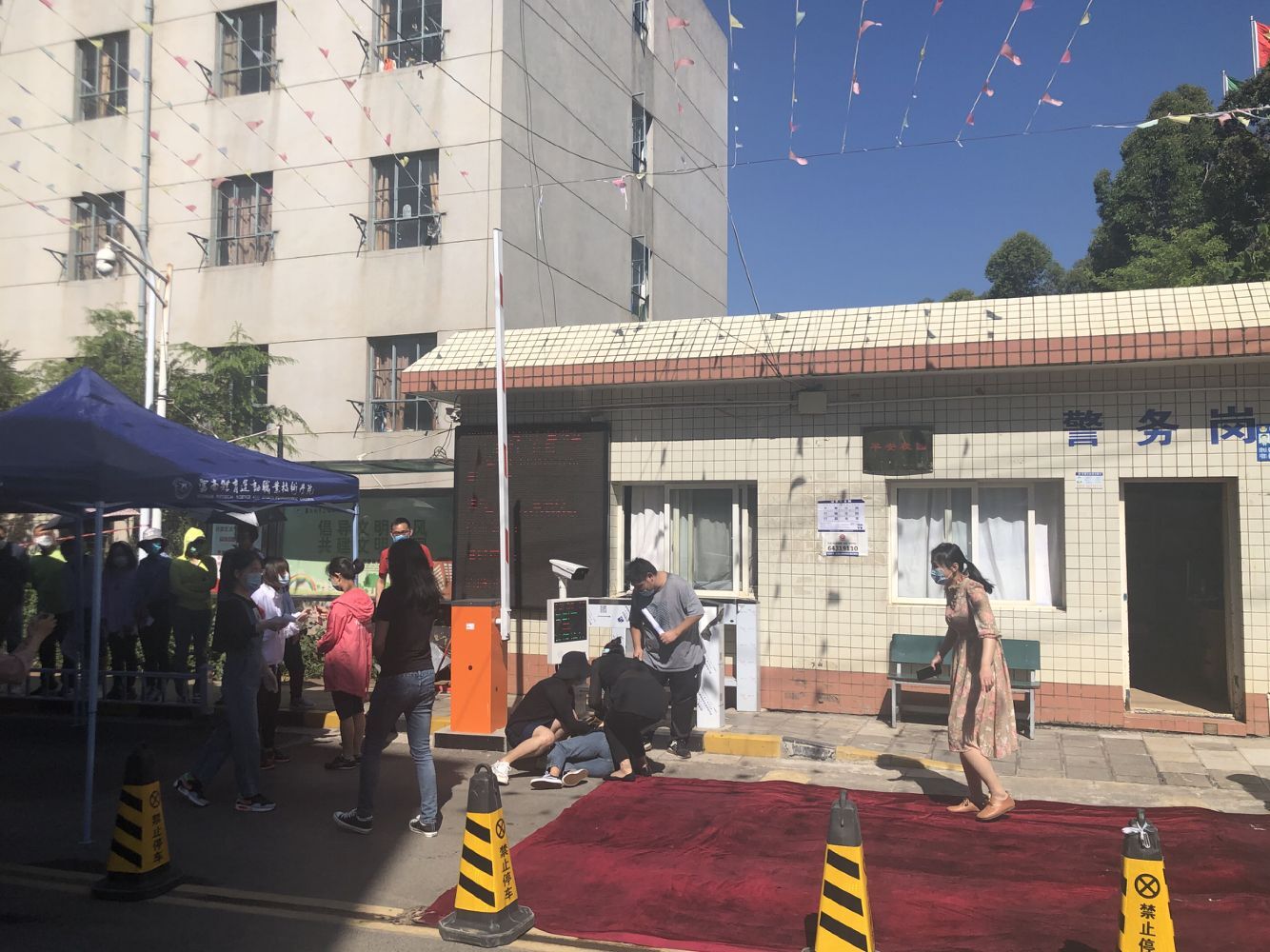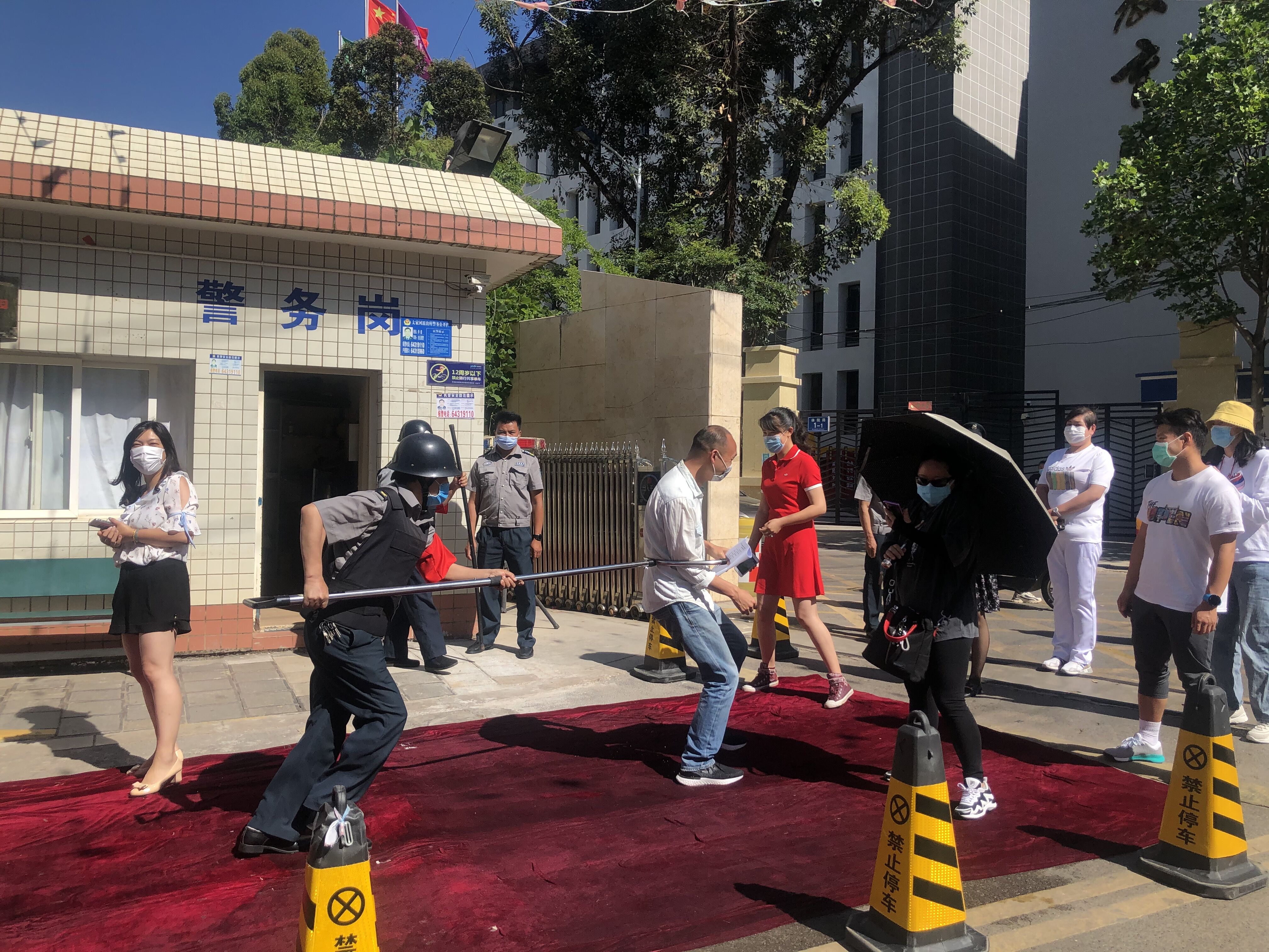 场景在学校大门安排了学生(教师扮演)、志愿者、身份核验人员、特殊情况人员等角色,对学生正常返校报到流程及特殊情况的应急处置进行了演练。