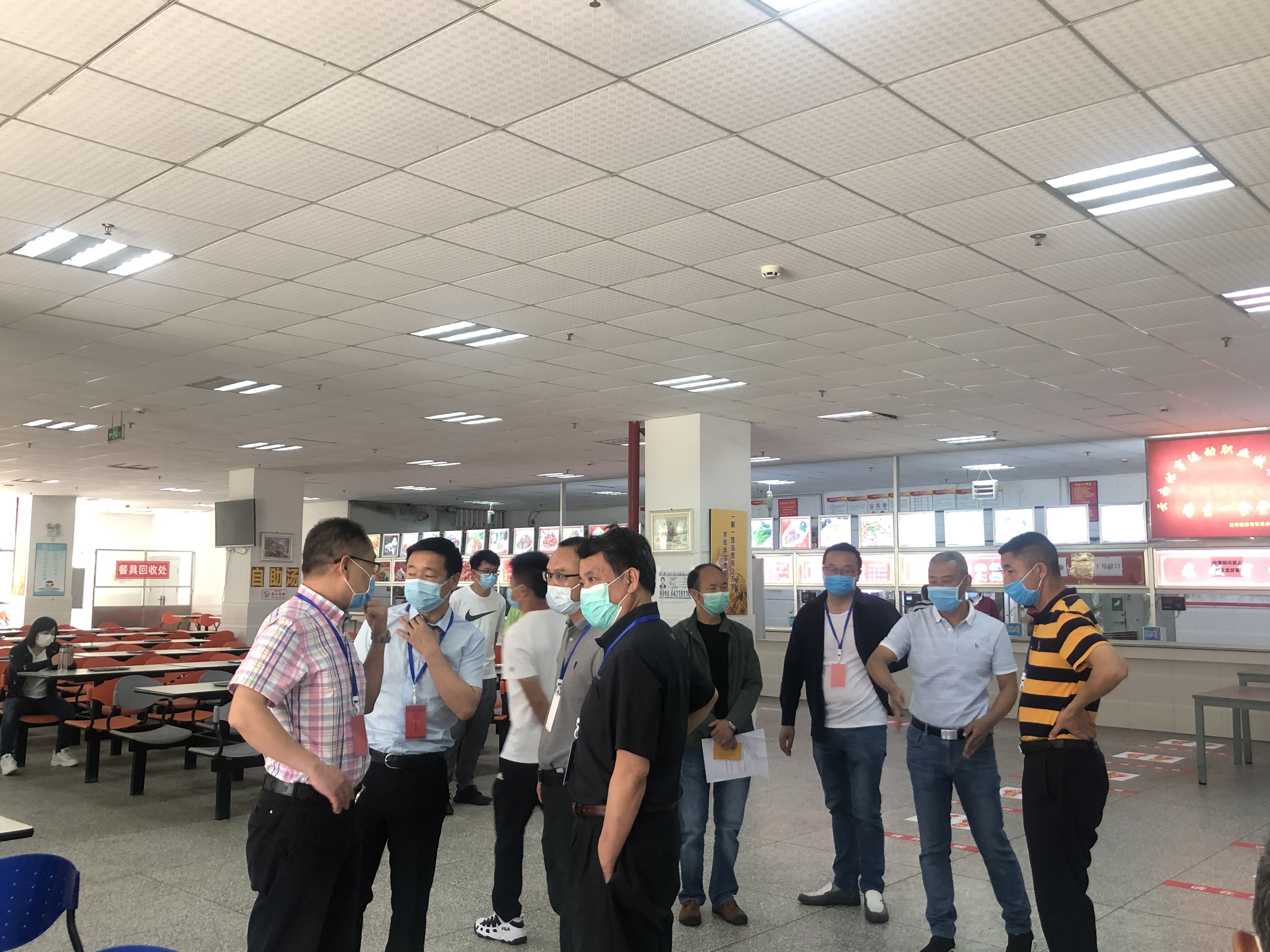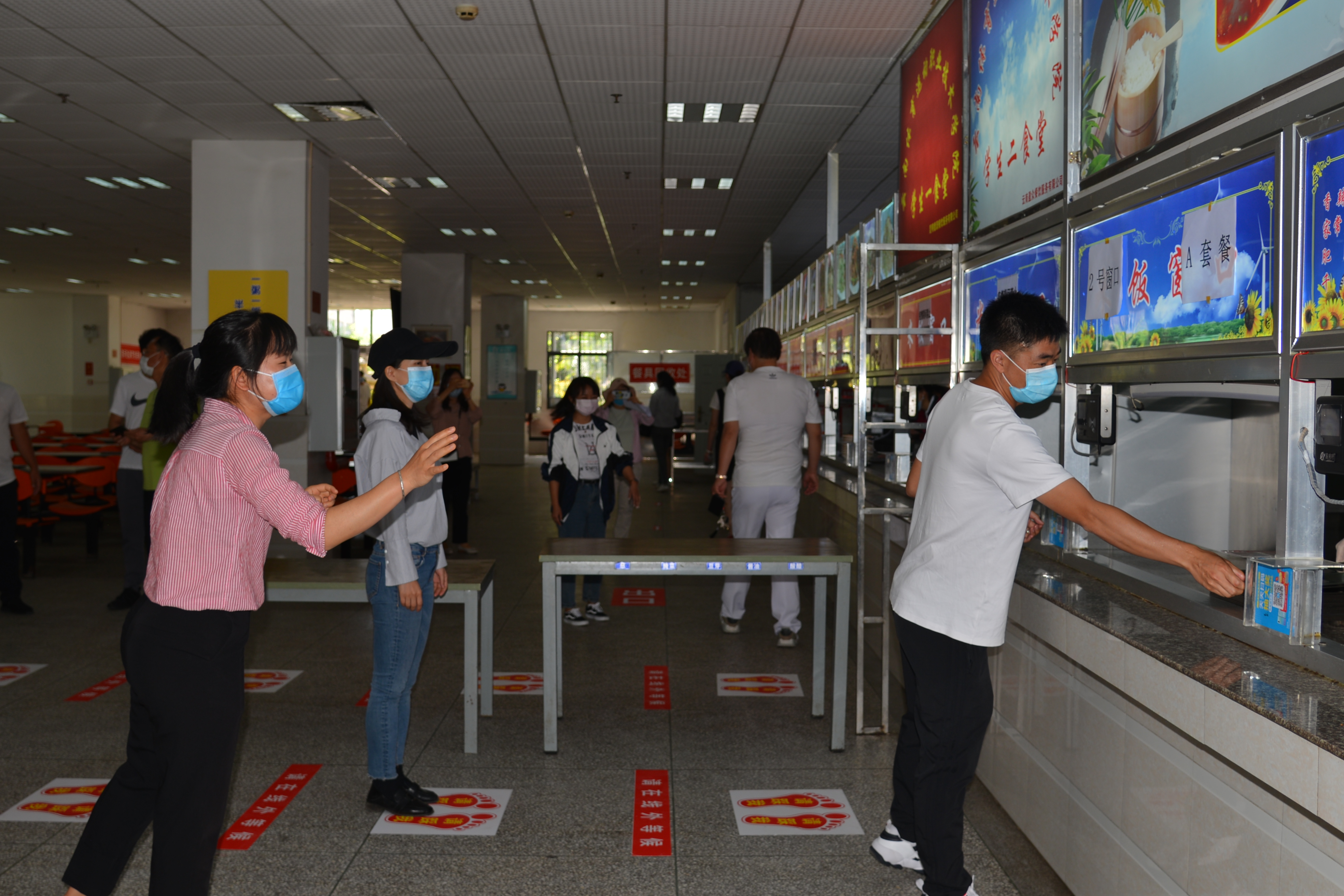 场景在学生一食堂安排了学生(教师扮演)、秩序维护人员等角色,对开学后实行配餐制时学生在食堂选餐、领餐的流程进行了演练。