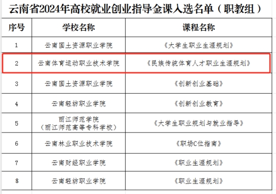 近日,中共云南省委教育工委公布了云南省2024年生涯教育和就业指导“四个一”活动之就业创业指导金课和直播课的遴选结果,best365《民族传统体育人才职业生涯规划》课程脱颖而出,成功入选云南省2024年高校就业创业指导金课,全省高职高专学校中仅有8门课程获此殊荣;就业指导直播课程《如何讲好自我介绍》与《群体面试及结构化面试》成功入选云南省2024年高校就业指导直播课程,在全省高职高专学校中,仅有12门直播课入选。