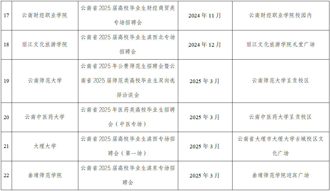 各场招聘会的具体举办时间、报名方式和参会要求都将在举办前至少2周,在云南高校毕业生智慧就业平台、承办高校就业信息网发布,有招聘需求的用人单位和毕业生可关注报名。